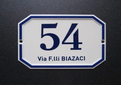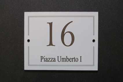 TUTTI IN NUMERI CIVICI (ESTERNI E INTERNI) E LE TARGHE NOME STRADA SONO DISPONIBILI IN VARIE DIMENSIONI E COLORAZIONI, STANDARD O PERSONALIZZATI/E.