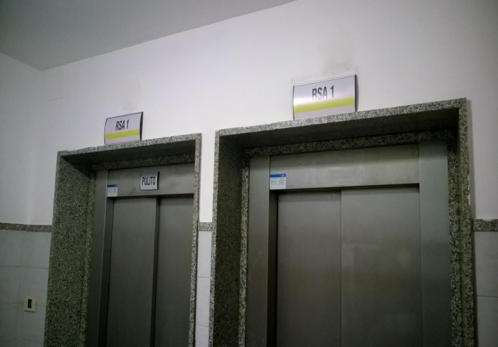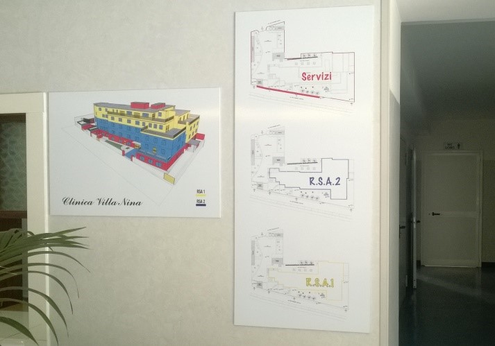 Elementi di comunicazione interna per strutture ospedaliere, case di cura e di riposo, laboratori, studi medici. Percorsi ad alta visibilità in vinile adesivo, quadri con leggende per visitatori, planimetrie, pannelli porta messaggi (monofacciale, bifacciale, a sospensione).