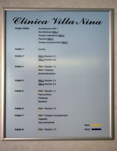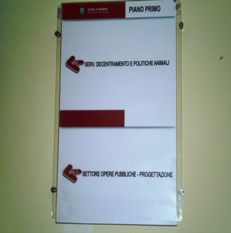 Si tratta di un servizio destinato a soddisfare le esigenze di uffici pubblici, cliniche, istituti bancari, laboratori, attività commerciali e professionali sprovvisti/e di un’adeguata segnaletica comunicativa. Tale servizio sta riscontrando nel corso degli anni un crescente successo, proprio in virtù della necessità di dotare gli uffici (ad esempio dei palazzi comunali) di una precisa denominazione ed indicazione, consentendo agli utenti di muoversi (all’interno delle strutture) con facilità e sicurezza (in conformità alle normative vigenti).